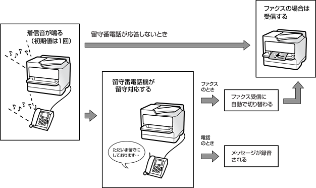 ファクスのときは、ファクス信号を自動検出します。ファクス受信が始まると、留守番電話は遮断されます。