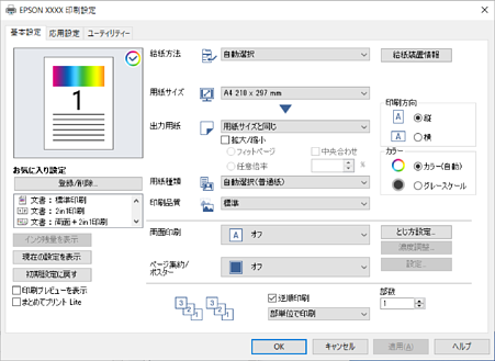 各項目の詳細は、プリンタードライバーのメニュー説明をご覧ください。