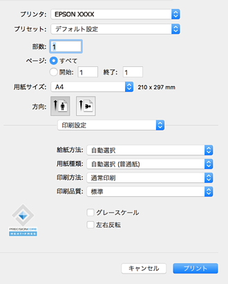 macOS Catalina (10.15)以降、macOS High Sierra (10.13)、macOS Sierra (10.12)、OS X El Capitan (10.11)、OS X Yosemite (10.10)、OS X Mavericks (10.9)で[印刷設定]メニューが表示されないときは、エプソンのプリンタードライバーが設定できていません。以下の方法で設定してください。