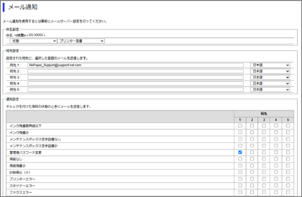 印刷停止やプリンターエラーなどのイベントが発生したときに、指定したアドレスにメールが送信されるようにメール通知を設定できます。宛先は5つまで登録でき、それぞれに受け取りたい通知を設定できます。