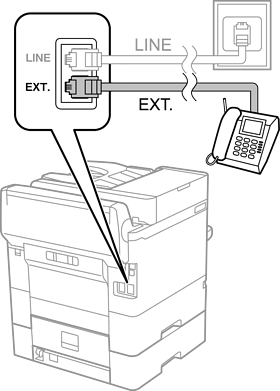 1つの電話回線で、ファクスと電話の両方を使用するときは、必ず外付け電話機をプリンターのEXT.ポートに接続してください。同回線にプリンターと並列で接続すると(ブランチ接続)、プリンターも電話機も正常な動作ができなくなります。
