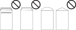 のり付けおよび接着の処理が施された封筒や二重封筒、ふたが円弧や三角形状の長形封筒や角形封筒は使用しないでください。紙詰まりや印刷汚れの原因になります。