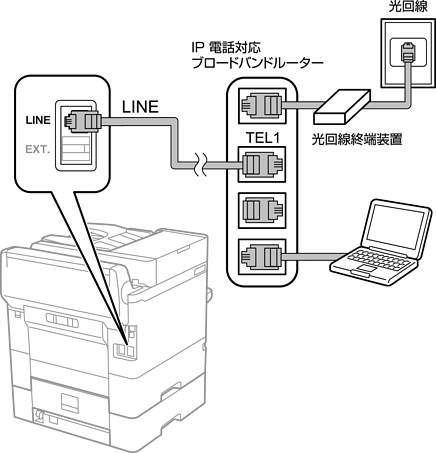 IP電話対応のブロードバンドルーターとプリンター背面部のLINEポートをモジュラーケーブルで接続します。詳しくはご契約の回線事業者に問い合わせてください 。