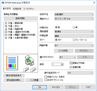 各項目の詳細は、プリンタードライバーのメニュー説明をご覧ください。