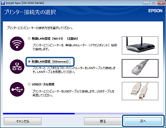 接続先選択の画面で有線LANを選択します。