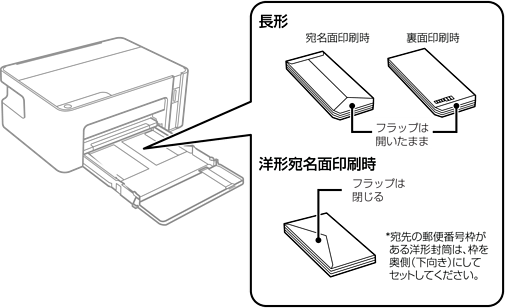 のり付けおよび接着の処理が施された封筒や二重封筒、窓付き封筒、ふたが円弧や三角形状の長形封筒や角形封筒は使用しないでください。紙詰まりや印刷汚れの原因になります。
