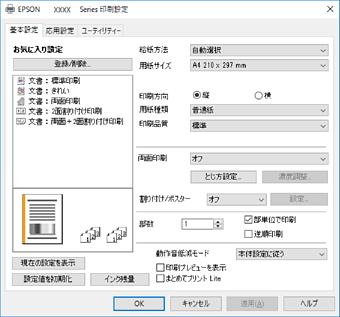 各項目の詳細は、プリンタードライバーのメニュー説明をご覧ください。