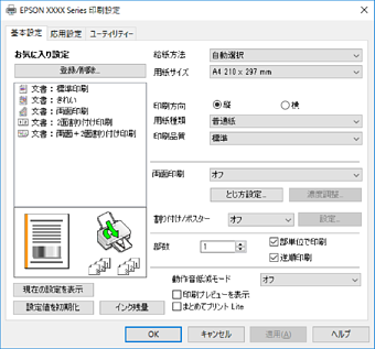 各項目の詳細は、プリンタードライバーのメニュー説明をご覧ください。