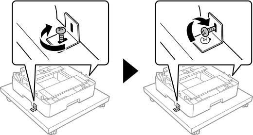 ネジ(c)を使って左右側面それぞれ1箇所ずつに固定金具(b)を取り付け、増設カセットユニットとプリンター台を固定します。