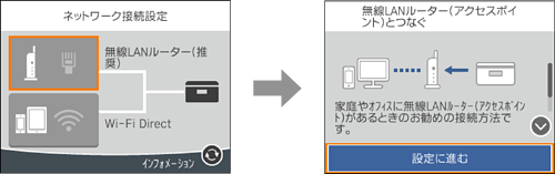 希望する接続方法のアイコンを選択して、次の画面で[設定に進む]を選択すると設定メニューが表示されます。