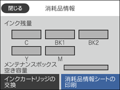 インク残量やメンテナンスボックス空き容量の目安が確認できます。インクカートリッジの交換や、消耗品情報の印刷もできます。