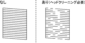5印刷したパターンを見てノズルに目詰まりがあるかないかを確認します。「あり」の図のように、部分的に印刷されていなかったり、線が欠けたりしているときは目詰まりしています。次の手順に進んでください。「なし」の図のように全ての線が印刷されているときは目詰まりしていません。