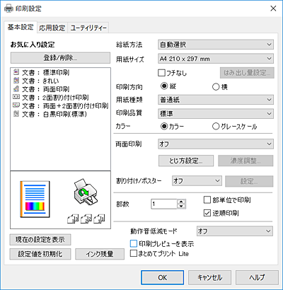 多用する設定の登録や削除ができます。登録した設定は、リストから選択することで使用できます。