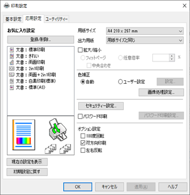 画像などの色を手動で補正して印刷します。[設定]をクリックするとユーザー色補正画面が開き、色補正の詳細な方法が選択できます。[画像処理設定]をクリックするとカラーユニバーサルプリントの設定、文字や細線を鮮明にしたり、Webスムージングや赤目補正を有効にしたりできます。