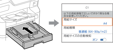 用紙カセット挿入時にプリンターに表示される画面で、用紙サイズと種類を登録しておくと、登録情報と印刷設定が異なるときにプリンターがお知らせします。サイズを間違って印刷してしまったり、用紙種類に合った印刷ができず色味が変わってしまったりすることを防ぎ、用紙やインクを無駄にせずに済みます。