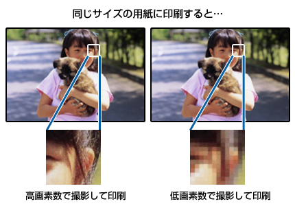デジタルカメラや携帯電話で撮影した写真データは、細かい点(画素)の集まりで構成されています。同じサイズの用紙に印刷するときには、この画素数が多いほどなめらかで高画質な印刷ができます。