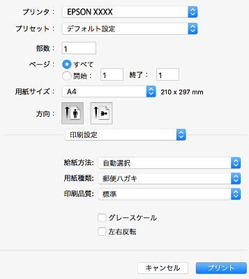 OS X Mountain Lion以降で[印刷設定]メニューが表示されないときは、エプソンのプリンタードライバーが設定できていません。