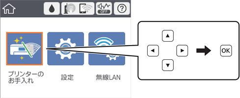 ボタンでフォーカスを動かし項目を選択します。OKボタンで項目の確定や機能を実行します。