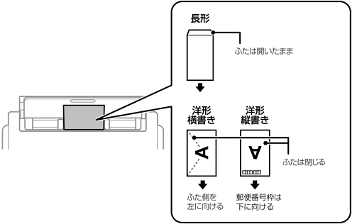 手差しトレイにセットするときは、印刷する面を手前にして中央にセットし、用紙ガイドを封筒に合わせてください。