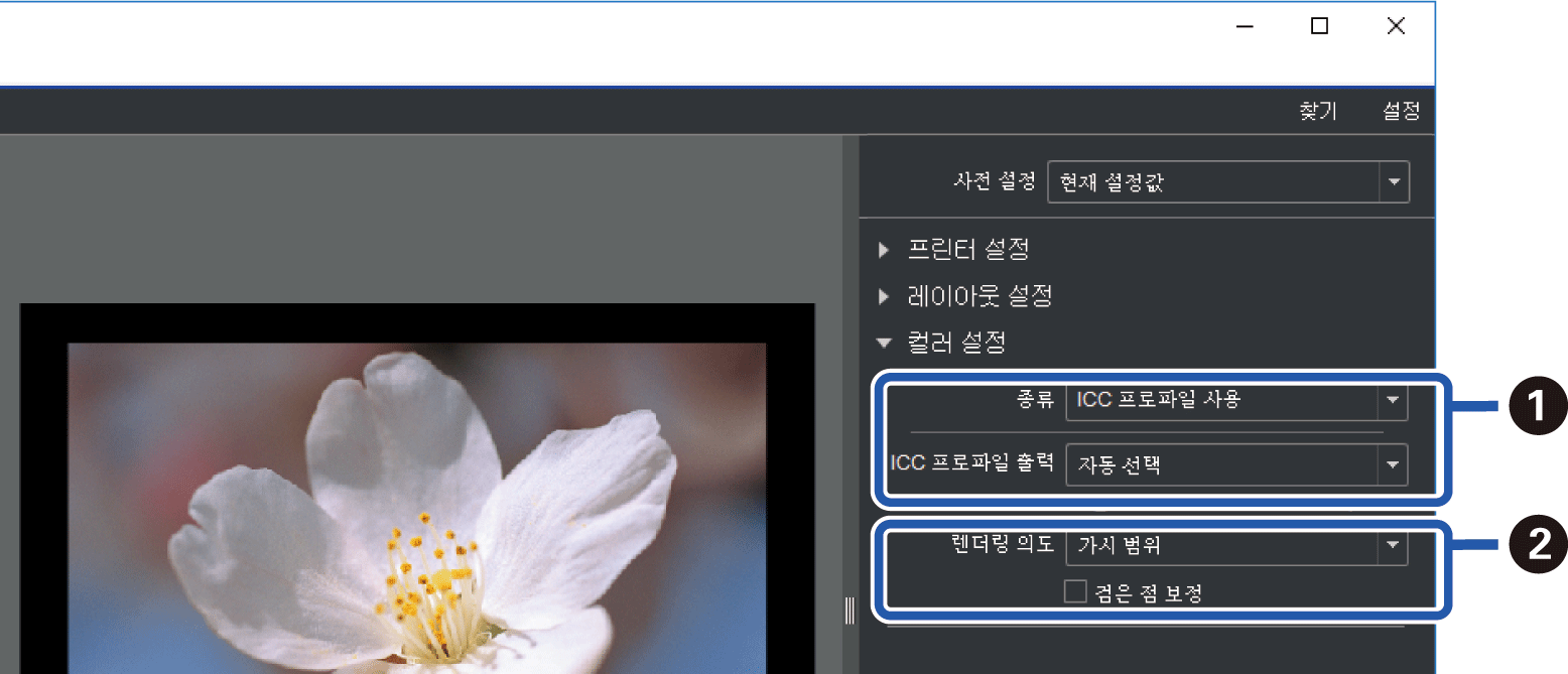 컬러 설정에서 색상 관리 방법을 설정 하십시오.