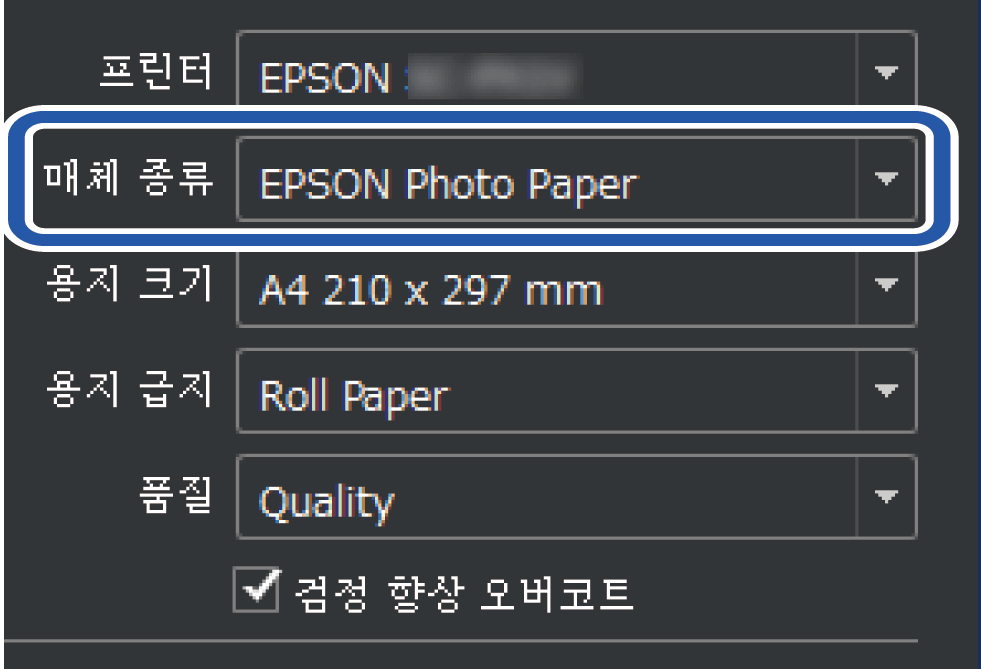 Epson Print Layout 또는 프린터 드라이버의 용지 종류 설정에서 대상 용지를 선택한 다음 인쇄 하십시오.