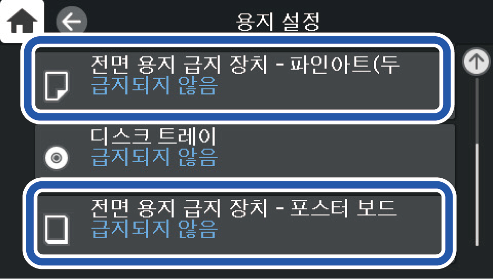 전면 용지 급지 장치 - 파인 아트 (두꺼운) 또는 전면 용지 급지 장치 - 포스터 보드를 선택합니다.