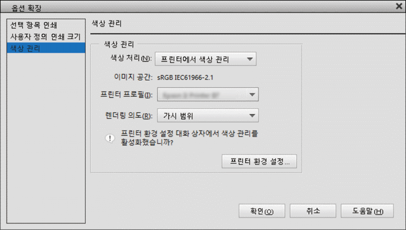 컬러 관리 기능이 있는 응용 프로그램을 사용하는 경우, 해당 응용 프로그램에서 컬러를 조정하는 방법을 지정합니다.
