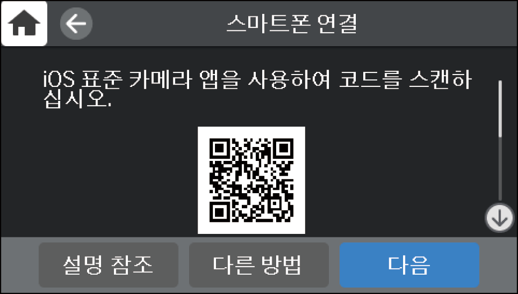 iPhone, iPad 또는 iPod touch에서 표준 카메라 앱을 실행한 후 사진 모드에서 프린터 제어판에 표시된 QR 코드를 스캔합니다.