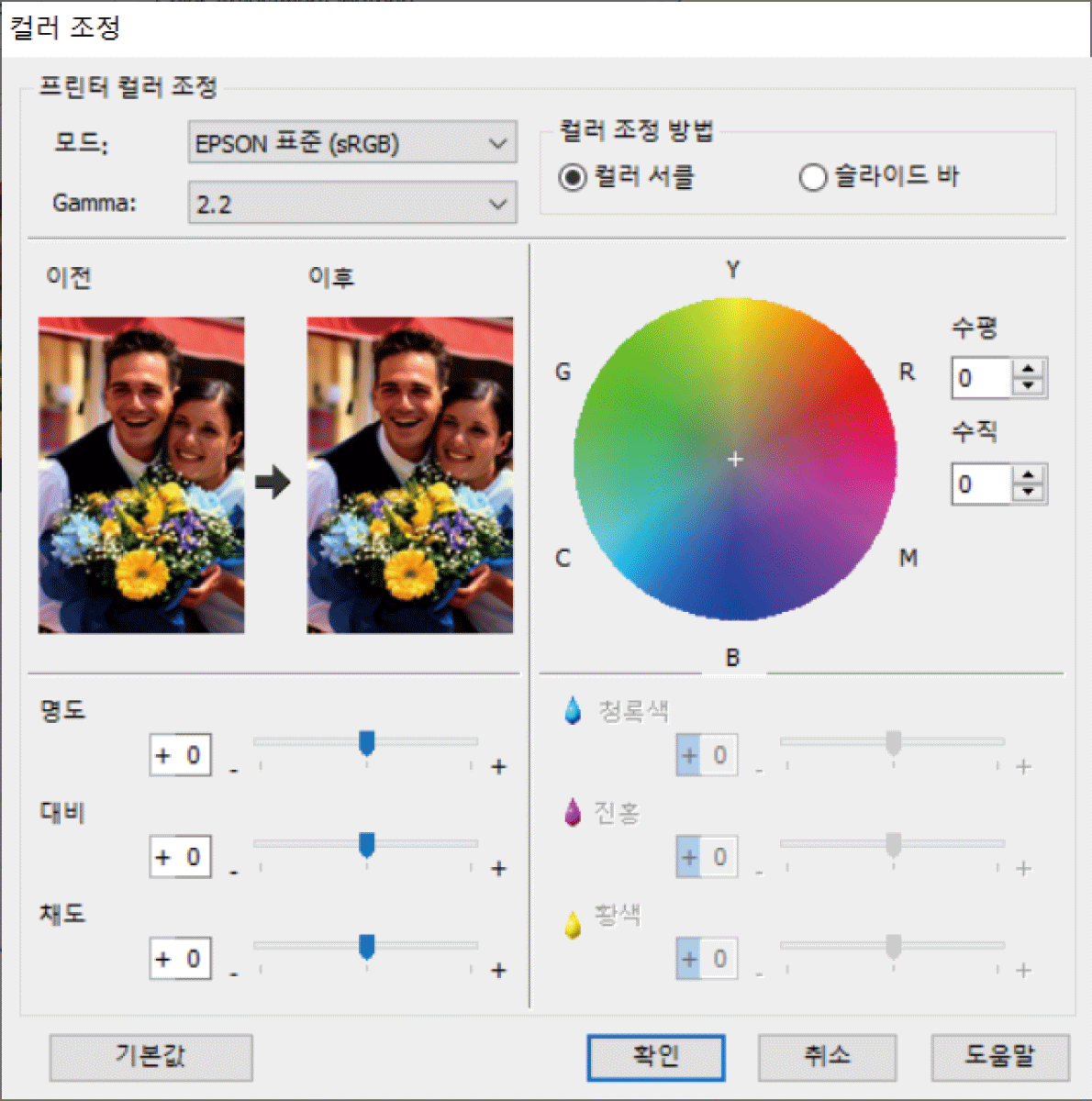 프린터 드라이버에서 인쇄할 이미지의 컬러 공간 (sRGB / Adobe RGB)과 일치하도록 모드를 설정하십시오.