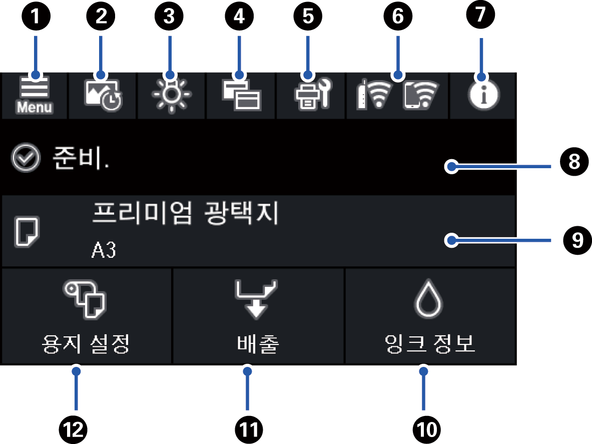 메뉴 화면을 표시합니다. 프린터 기능 및 작동과 관련된 설정을 지정할 수 있습니다. |