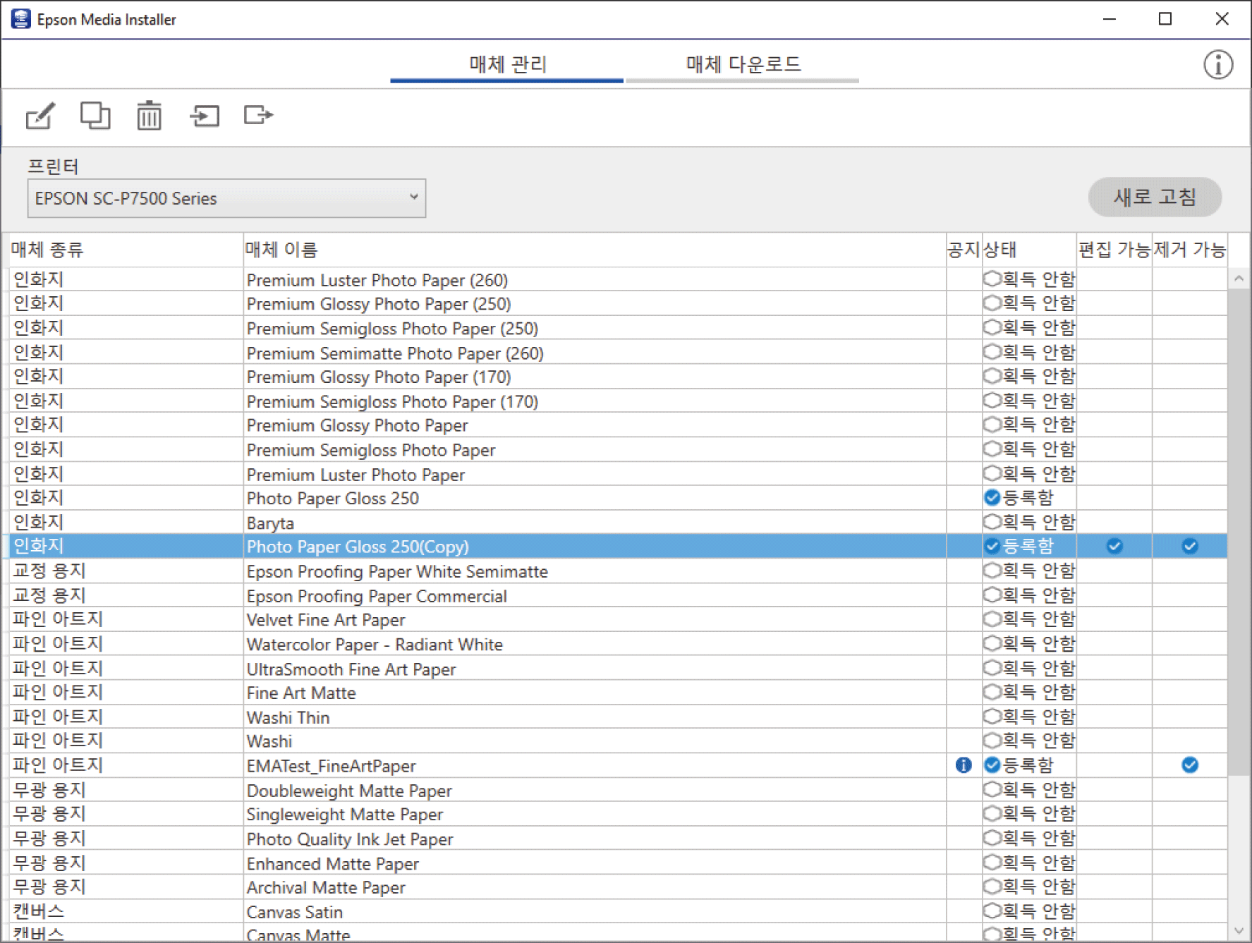 편집은 복사된 용지 정보 (미디어 설정) 에만 수행됩니다. 원본 용지 정보를 직접 편집할 수 없습니다. 상태가 등록됨인 용지의 용지 정보를 복사할 수 있습니다.