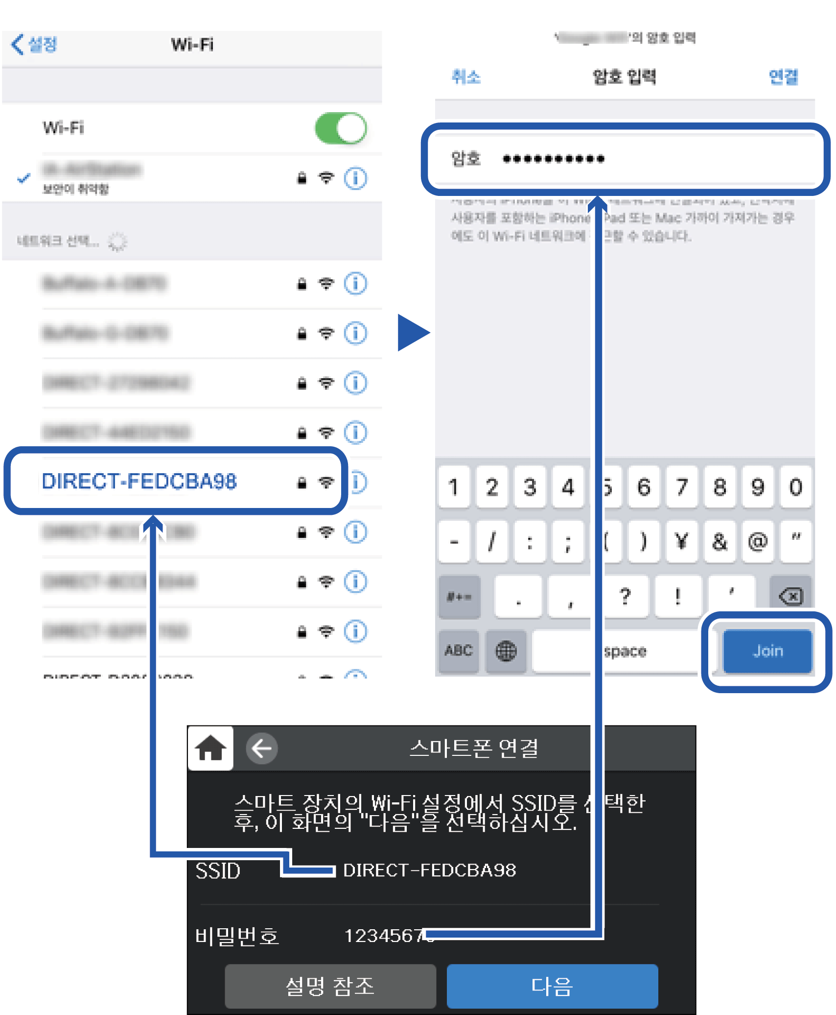 스마트 장치의 Wi-Fi 화면에서 프린터 제어판에 표시된 SSID를 선택하고 비밀번호를 입력합니다.