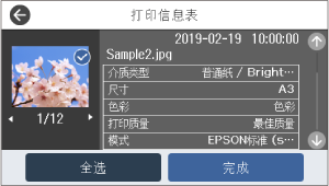 最后 12 张照片的打印信息会保存在本产品中。例如,如果将一张照片打印三份,本产品会保存三份打印历史记录。您可以通过选择要打印的信息来打印照片信息。但是,本产品关闭后,照片打印信息会被删除。