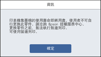 顯示下列畫面時,使用者不可更換該部分。請聯絡 Epson 支援服務。您必須更換零件,才可執行無邊列印。您仍可執行邊界列印。然而,如果繼續使用,則在光面紙上列印的速度可能降低。