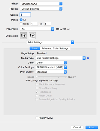 Nếu menu Cài đặt in không hiển thị trên macOS High Sierra, macOS Sierra, OS X El Capitan, OS X Yosemite, OS X Mavericks, thì trình điều khiển máy in Epson chưa được cài đặt đúng cách. Bật tại menu sau.