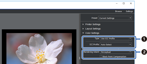 گزینه Use ICC Profile را از بخش Type انتخاب کنید. وقتی Auto Select را از Output ICC Profile انتخاب میکنید، نمایه ICC مربوط به کاغذ انتخابی در مرحله 2 به صورت خودکار تنظیم میشود. |