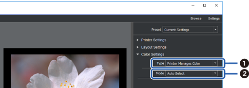 Type से Use ICC Profile चुनें। जब आप Auto Select से Output ICC Profile चुनते हैं, तो चरण 2 में चुने गए कागज़ के लिए ICC प्रोफ़ाइल स्वतः सेट हो जाती है। |