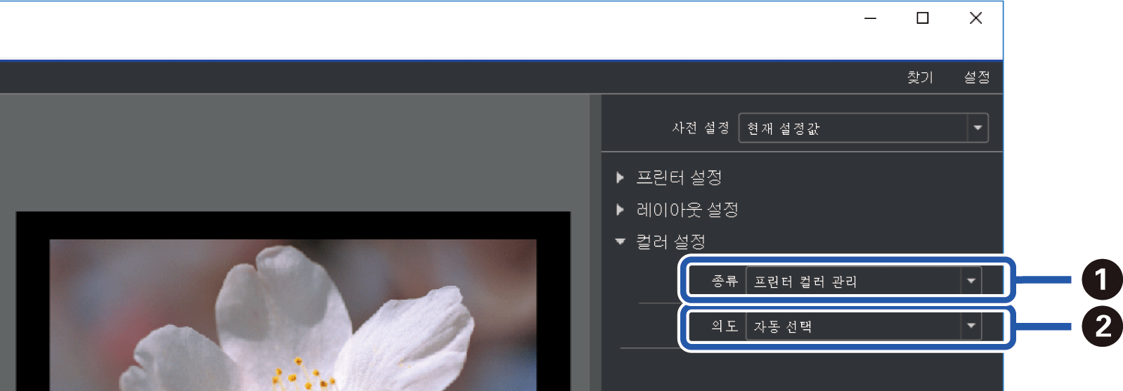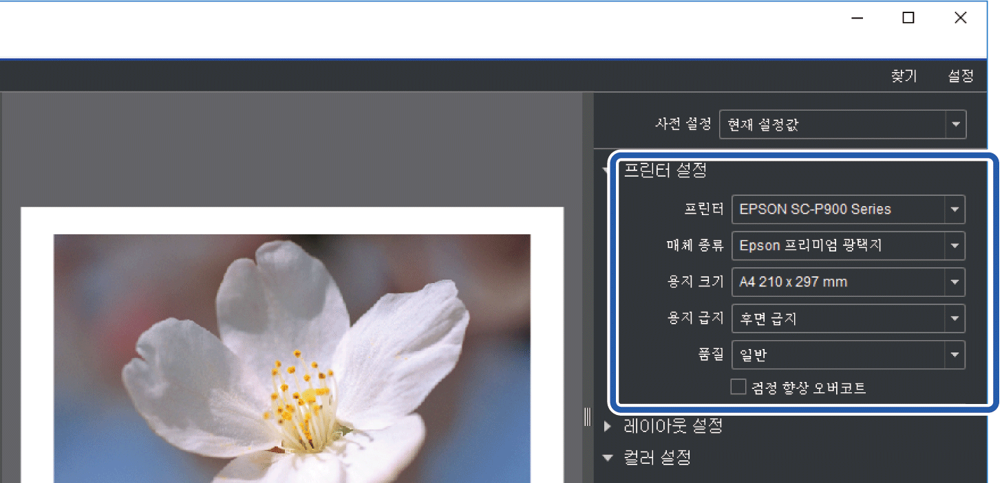 컬러 설정에서 색상 관리 방법을 설정 하십시오.