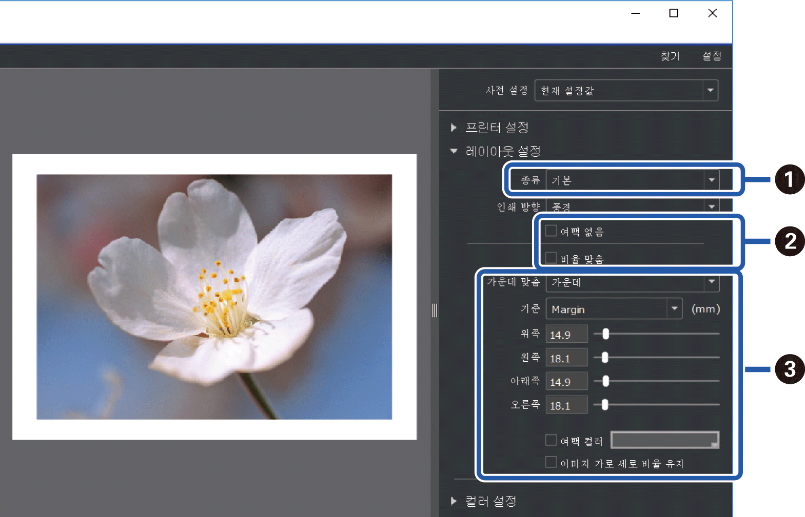 레이아웃 설정에서 인쇄 레이아웃을 설정 하십시오.