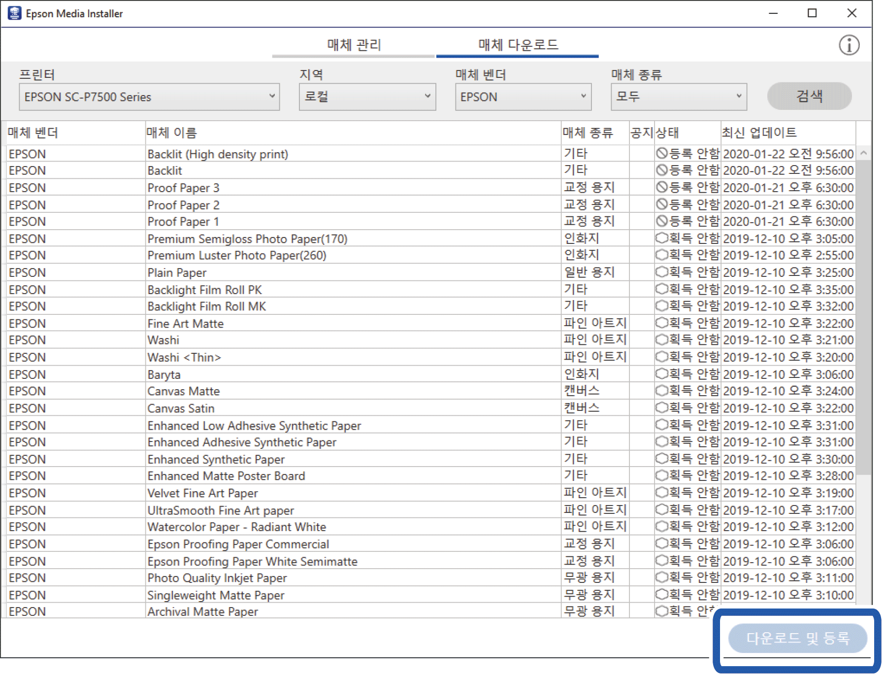대상 용지를 선택하고 다운로드 및 등록을 클릭하십시오.