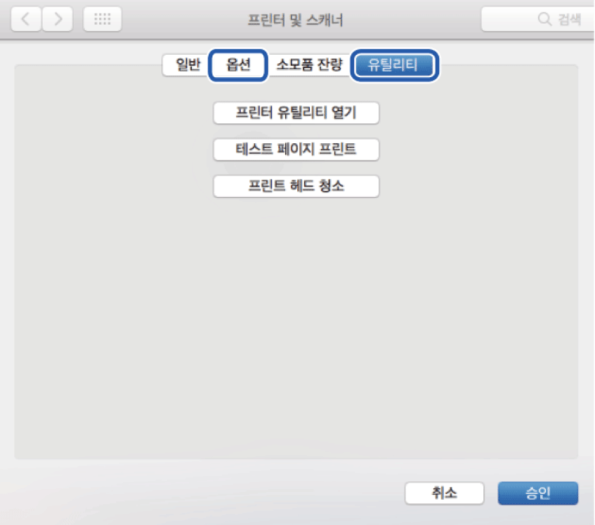 Apple 메뉴에서 시스템 환경설정 > 프린터 및 스캐너 (또는 프린트 및 스캔, 프린트 및 팩스)를 선택한 후 프린터를 선택합니다. 옵션 및 소모품을 클릭한 후 옵션 탭 및 유틸리티 탭이 창에 표시되면 Epson 정품 프린터 드라이버가 컴퓨터에 설치되어 있는 것입니다.