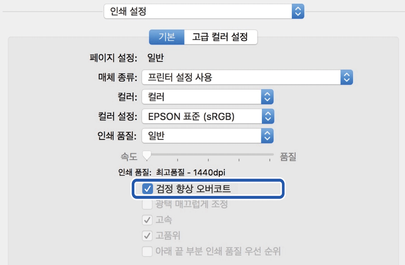 검정 향상 오버코트를 활성화하면 검정색 농도가 증가하고, 비활성화하면 인쇄 속도가 빨라집니다.