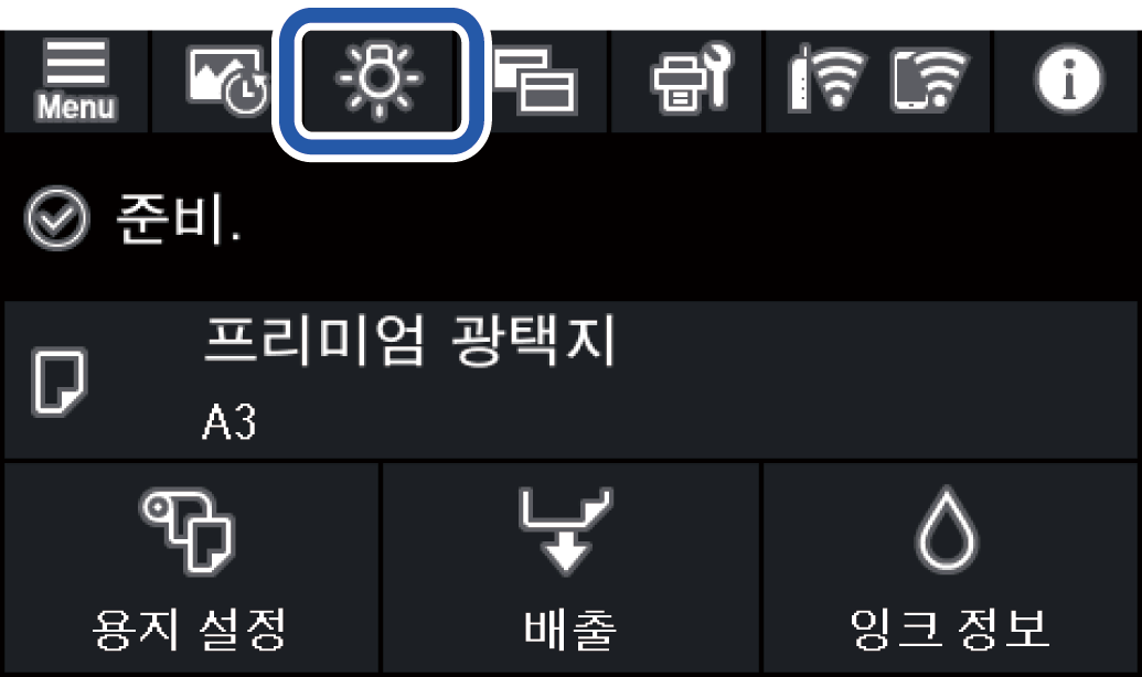 인쇄가 시작되면 내부 조명이 켜지면서 프린터 덮개를 통해 인쇄되는 모습을 볼 수 있습니다. 조명을 끄려면 아래 설명에 따라 홈 화면에서 설정하십시오.