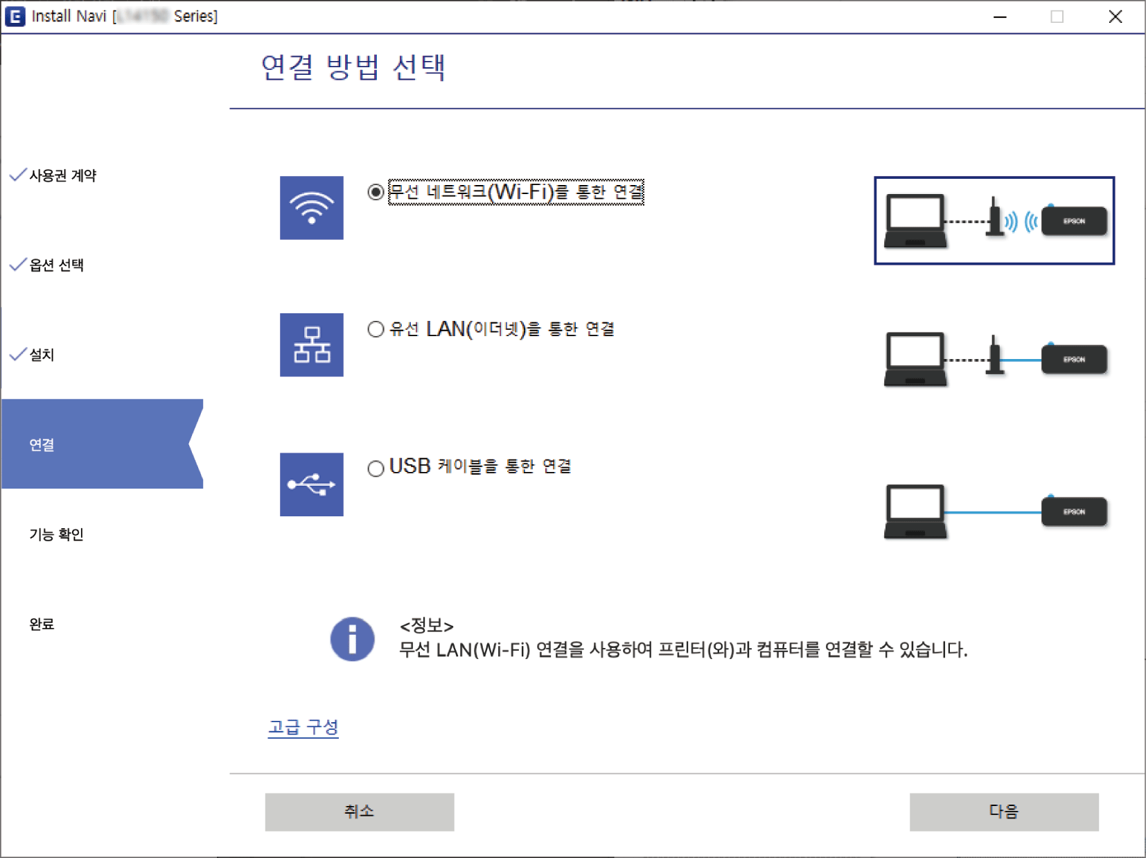 사용할 네트워크 연결로 무선 네트워크(Wi-Fi)를 통한 연결 또는 유선 LAN(이더넷)을 통한 연결을 선택하고 다음을 클릭합니다.
