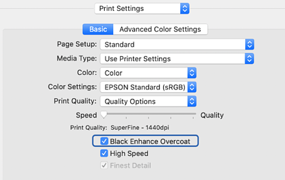 Enabling black enhance overcoat increases black density, and disabling it increases print speed.