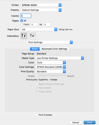 If the Print Settings menu is not displayed on macOS High Sierra, macOS Sierra, OS X El Capitan, OS X Yosemite, OS X Mavericks, the Epson printer driver has not been installed correctly. Enable it from the following menu.