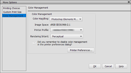 Pilih Pengurusan Warna dan kemudian, pilih Photoshop Menguruskan Warna daripada Pengendalian Warna. Pilih profil ICC kertas daripada Profil Pencetak dan klik Keutamaan Pencetak.