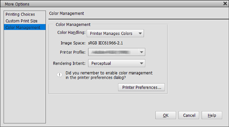 Vyberte možnosť Správa farieb a potom vyberte položku Farby spravuje tlačiareň v možnosti Spracovanie farieb. Kliknite na položku Predvoľby tlačiarne.