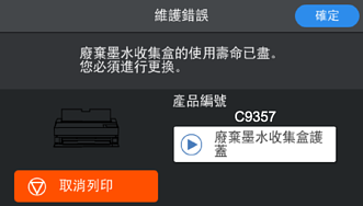 在某些列印循環中,可能會有非常少量的多餘墨水聚集在廢棄墨水收集盒內。為避免從廢棄墨水收集盒漏出墨水,印表機具有可在吸收容量達到廢棄墨水收集盒限制時停止列印的設計。是否需要更換及更換的頻率將會因您的列印頁數、列印的素材類型以及印表機所進行的清潔循環次數而有不同。