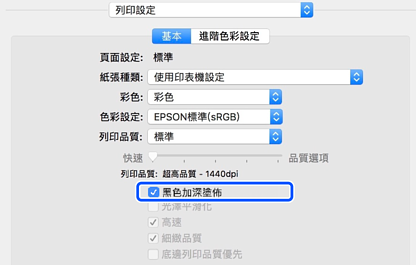 啟用黑色加強上層塗佈功能會提高黑色濃淡度,停用則會增加列印速度。
